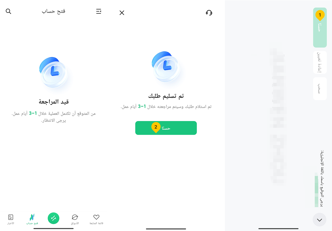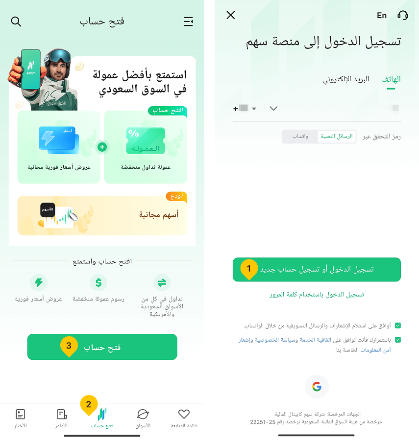 الخطوة 1: قم بتسجيل الدخول إلى حسابك في منصة سهم وانتقل إلى قسم "فتح حساب" الموجود أسفل الصفحة. انقر على "فتح حساب" لبدء العملية.