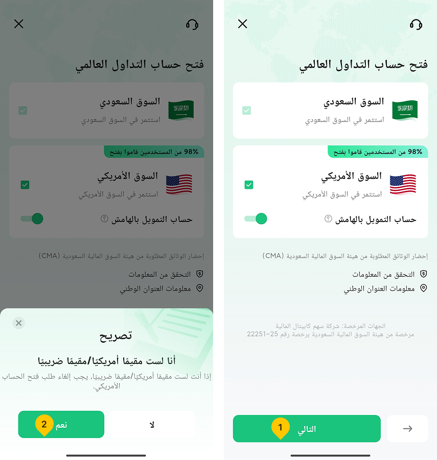 الخطوة 2: اختر نوع الحساب الذي تريد فتحه. سواء حساب الأوراق المالية السعودية أو الأمريكية أو كلاهما. كما يمكنك تحديد ما إذا كنت ترغب في فتح حساب الهامش أيضًا، ثم انقر على التالي للمتابعة.