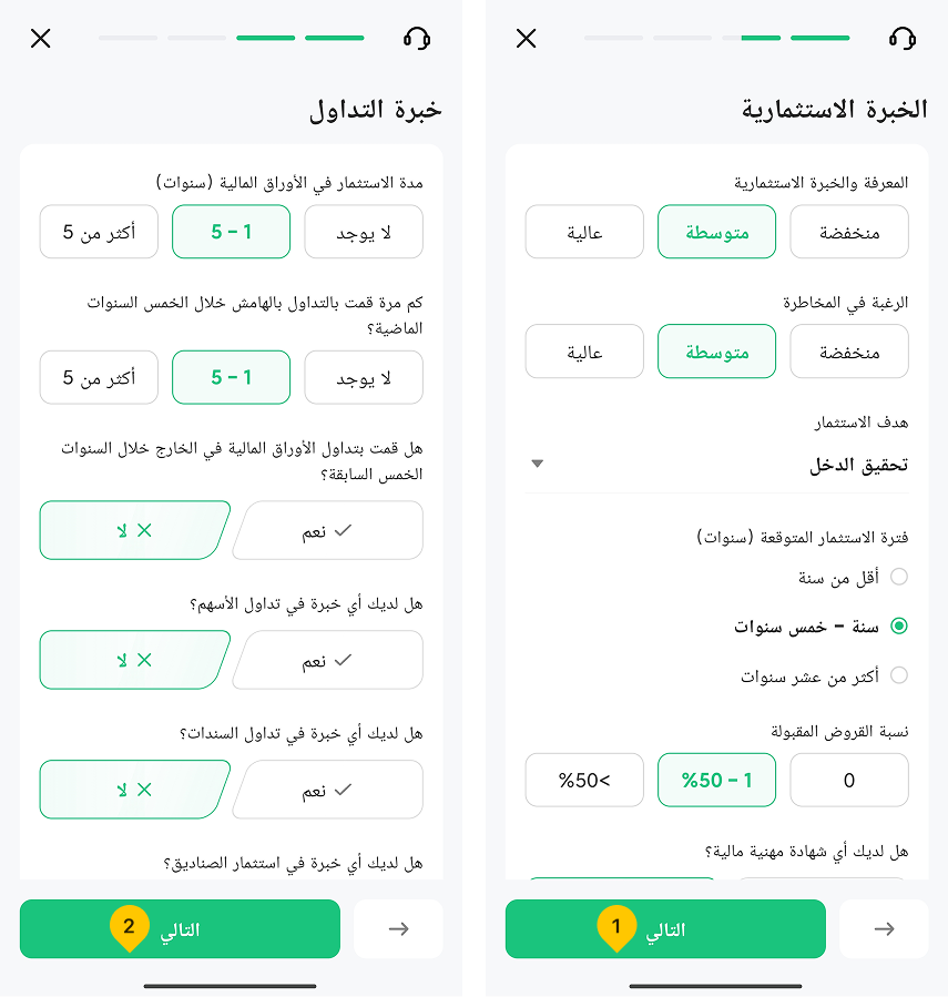الخطوة 4: أجب عن الأسئلة المتعلقة بخبرتك في التداول، حيث سيساعد ذلك على تقديم خدمات استثمارية مخصصة لتلبية احتياجاتك وأهدافك.