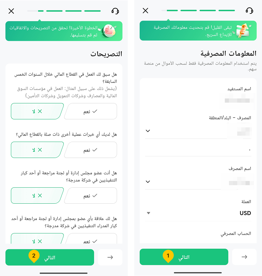 الخطوة 7: املأ معلوماتك المصرفية، ثم أجب على أسئلة التحقق من خبراتك المالية وانقر على "التالي".