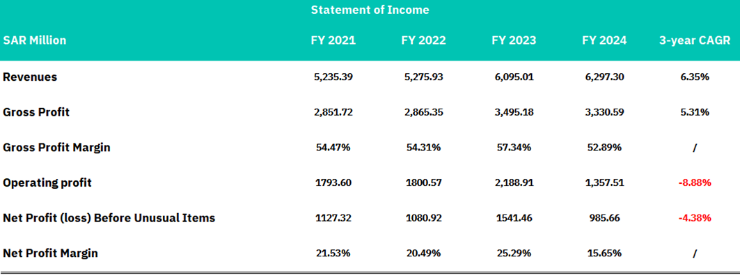 However, the company's operating and net profit performance reveals concerning trends that warrant investor attention. Operating profit declined sharply with a negative 8.88% CAGR, falling from SAR 1,793.60 million in 2021 to SAR 1,357.51 million in 2024, despite the revenue growth. This deterioration reflects significant operating expense inflation that has outpaced revenue growth, particularly evident in the dramatic drop from SAR 2,188.91 million operating profit in 2023 to SAR 1,357.51 million in 2024. Similarly, net profit before unusual items contracted at a negative 4.38% CAGR, with net profit margins compressing from 21.53% in 2021 to 15.65% in 2024. While ACWA Power maintains a solid market position with consistent revenue growth and strong gross margins, the deteriorating operational leverage and margin compression suggest management needs to address cost structure efficiency to restore earnings momentum and maximize shareholder value creation.