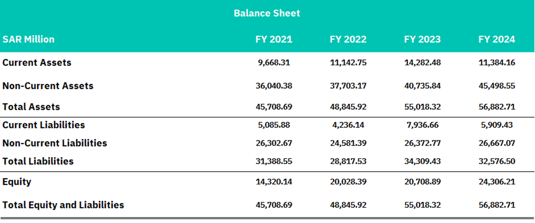 The company's capital structure reveals disciplined financial management with a strengthening equity position that grew from SAR 14,320.14 million in 2021 to SAR 24,306.21 million in 2024, representing a 69.7% increase and improved capitalization. Total liabilities increased modestly from SAR 31,388.55 million to SAR 32,576.50 million, indicating controlled debt growth relative to asset expansion. The debt-to-equity ratio improved significantly from 2.19x in 2021 to 1.34x in 2024, demonstrating enhanced financial stability and reduced leverage risk. Current liabilities showed some volatility, spiking to SAR 7,936.66 million in 2023 before moderating to SAR 5,909.43 million in 2024, likely reflecting project financing dynamics and working capital requirements tied to large-scale infrastructure development cycles. This balance sheet evolution supports ACWA Power's long-term growth strategy while maintaining financial flexibility for future expansion opportunities.