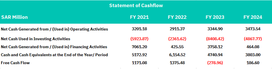 ACWA Power has maintained strong operational cash generation throughout the 2021-2024 period, with operating cash flows growing from SAR 3,201.18 million in 2021 to SAR 3,473.54 million in 2024, demonstrating the company's ability to convert earnings into cash effectively. The temporary dip to SAR 2,911.37 million in 2022 was followed by robust recovery to SAR 3,344.90 million in 2023, indicating resilient underlying business fundamentals. This consistent operating cash flow generation of over SAR 3 billion annually provides ACWA Power with substantial financial flexibility to fund growth initiatives and service its capital requirements. The strong and stable operating cash flows reflect the predictable revenue streams typical of long-term power purchase agreements and infrastructure concessions that characterize the company's business model.