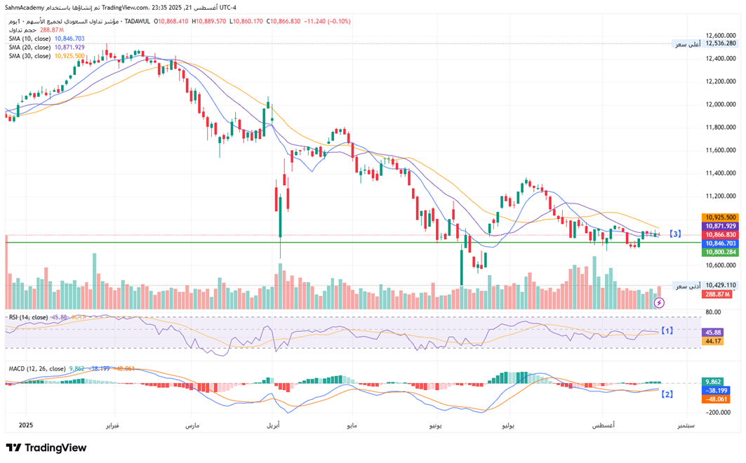 The TASI index is currently exhibiting signs of stabilization around current levels near 10,866. The price action has formed a descending channel pattern throughout the decline, recent sessions show the index consolidating around key moving averages with the current price (10,866) positioned between the SMA 10 (10,846) and SMA 20 (10,871), suggesting a potential inflection point.