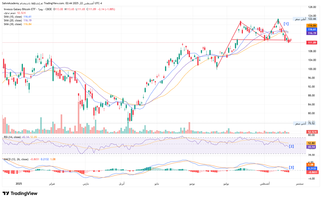 The BTCO Bitcoin ETF is currently experiencing a significant technical breakdown after reaching new highs around 122.66 in July, having since declined approximately 9% to current levels near 111.89. The ETF has broken below all major moving averages (SMA 10: 116.61, SMA 20: 116.19, SMA 30: 116.84), with the moving averages now in bearish alignment, signaling a potential trend reversal from the strong uptrend that dominated the first half of 2025.