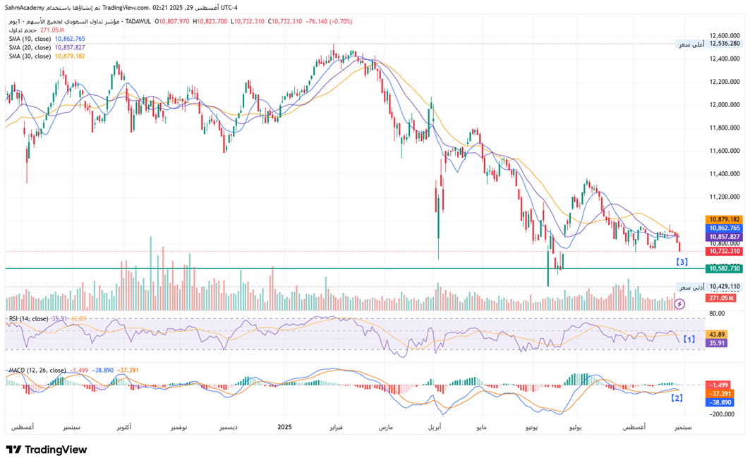 TASI presents a bearish outlook with the index currently trading at 10,732.310, down 0.70% from the previous session. The price action shows a clear downtrend that began from the February 2025 highs around 12,500 levels, with the index breaking below critical support levels. The moving average structure is decisively bearish, with the 10-day SMA (10,862.765), 20-day SMA (10,857.827), and 30-day SMA (10,879.182) all trading above the current price and acting as dynamic resistance.