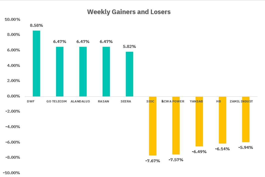From the perspective of individual stock performance, 89 companies saw their stock prices rise this week, while 177 companies saw their stock prices fall. The companies with the highest increase included DWF, GO TELECOM, ALANDALUS, with increases of 8.58%, 6.47%, and 6.47% respectively. The companies with the highest decline included SIDC, ACWA POWER, YANSAB with declines of 7.67%, 7.57 %, and 6.49% respectively.