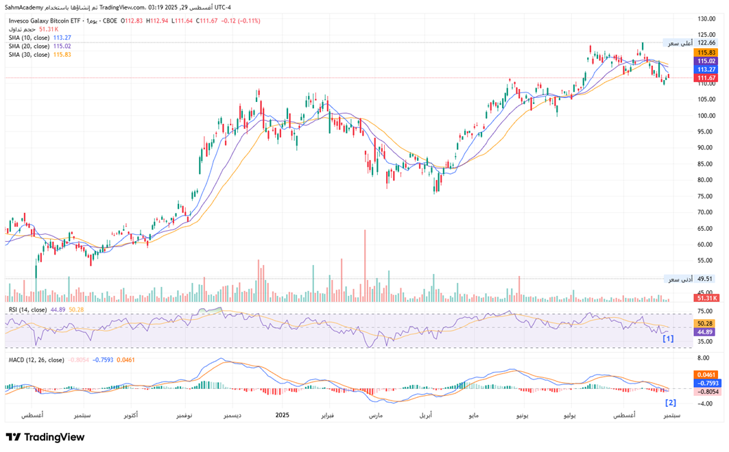 The BTCO is currently exhibiting signs of technical weakness. The ETF has experienced a significant correction from its August 2025 highs near $122.66, representing approximately a 9% decline that has broken through several key technical levels. The moving average structure presents a mixed picture, with the current price trading below the 10-day SMA at $113.27 and 20-day SMA at $115.02, while still maintaining support above the 30-day SMA at $115.83. This configuration suggests short-term bearish pressure with the potential for further downside if the 30-day moving average fails to hold.