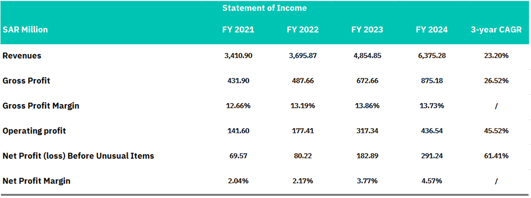 Revenue experienced remarkable expansion from SAR 3,411 million in FY 2021 to SAR 6,375 million in FY 2024, representing an outstanding 23.20% compound annual growth rate (CAGR). This revenue momentum translates into strong bottom-line results, with net profit before unusual items surging from SAR 69.57 million to SAR 291.24 million over the same period, achieving an impressive 61.41% CAGR. The company's operating leverage is evident as operating profit grew even more aggressively at a 45.52% CAGR, reaching SAR 436.54 million in FY 2024, indicating effective cost management and operational efficiency improvements.