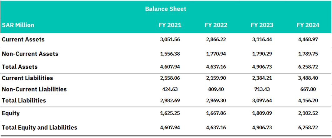 The liability structure reveals mixed trends that warrant careful monitoring from a credit perspective. Current liabilities increased significantly from SAR 2,558 million to SAR 3,488 million, growing at a faster pace than current assets and potentially indicating liquidity pressure despite the overall increase in current assets. Interestingly, non-current liabilities declined from SAR 425 million in FY 2021 to SAR 668 million in FY 2024 after peaking at SAR 809 million in FY 2022, suggesting potential debt restructuring or repayment activities. Total liabilities increased from SAR 2,983 million to SAR 4,156 million, representing a 39.3% growth that outpaced asset growth, indicating increased financial leverage.
