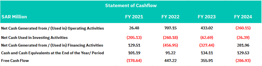 Financing activities show a company actively managing its capital structure to support growth initiatives and address cash flow volatility. The company raised substantial funds through financing activities in FY 2021 (SAR 129.51 million) and FY 2024 (SAR 281.96 million), while conducting significant cash returns or debt repayments in FY 2022 (SAR -456.95 million) and FY 2023 (SAR -327.44 million). Free cash flow turned significantly negative in FY 2021 and FY 2024 at SAR -178.64 million and SAR -286.93 million respectively, indicating the company's growth requires external financing. The cash position declined from SAR 134.11 million in FY 2023 to SAR 129.53 million in FY 2024, leaving limited liquidity buffers.