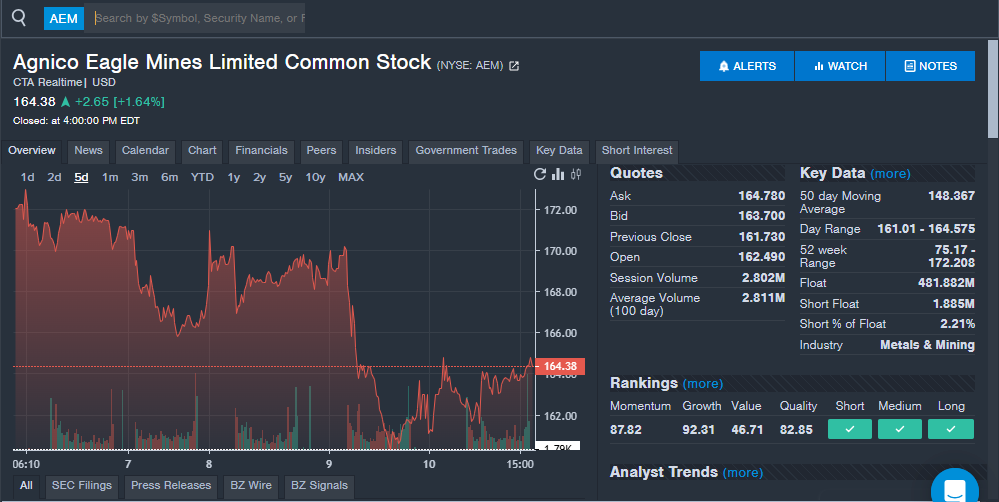 Agnico-Eagle Mines Limited AEM | 164.38 | +1.64% |